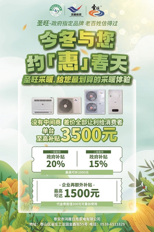在這個寒冷的季節(jié),選擇圣旺品牌的空氣源熱泵熱風機、燃氣壁掛爐及空氣能機組等采暖設備,不僅能享受優(yōu)惠補貼,更是為環(huán)保貢獻一份力量。歡迎廣大消費者前來選購,讓我們一起溫暖過冬!